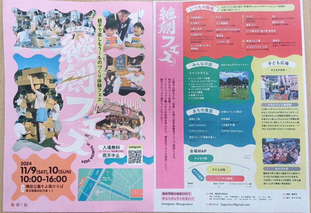 墨田継創フェスは墨田区の技術を持った職人さんたちの若手後継者グループの開くものづくり体験フェスです。主にお子様連れの家族の方に楽しんでいただくための工夫を凝らした遊びがいっぱいあり、みんな夢中になっていました。もちろんお父さんお母さん方にもおいしそうなクラフトビール、ワインや食べ物のお店も出てました。継創フェスは11月9~10日16時までです。墨田区家族葬窓口は24時間365日、ご葬儀に関するご相談を受け付けています。葬祭ディレクター1級が在籍、誠心誠意サポートいたします。お電話でのお問い合わせ03‐5608-4949