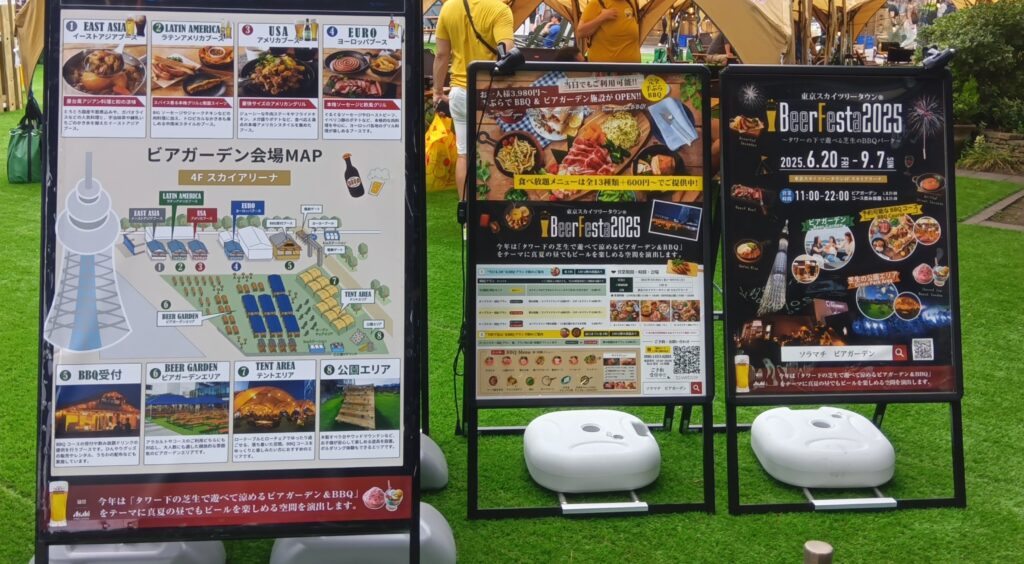 東京ソラマチ4FスカイアリーナでBeer Festa2025開催中です。「タワー下の芝生で遊べて涼しめるビアガーデン&BBQ」をテーマに真夏の昼間でもビールを楽しめる空間を演出しているそうです。今年は世界4つのエリア(ユーロ、アメリカ、東アジア、ラテンアメリカ)からアラカルトフーズやビールを味わえます。確かに芝生の上でのバーベキューは夜よりも昼間の方が合いそうな気がしますね。訪問したのは平日の15時過ぎでお客さんはまばらでしたがインバウンドの外人さんが豪快に飲んで食べていました。今日は曇りで少し気温も低かったですが猛暑でも大丈夫なようにミストがしっかり稼働していて近くでは風鈴のアーチが涼しげな音を立てていました。たまにはこんな飲み方もアリかも・・。期間も長く9月7日まで開催しています。墨田区家族葬窓口は24時間365日、ご葬儀に関するご相談を受け付けています。葬祭ディレクター1級が在籍、ご家族の想いに寄り添ってお応えいたします。【電話】0120-56-4940お気軽にお問い合わせください。