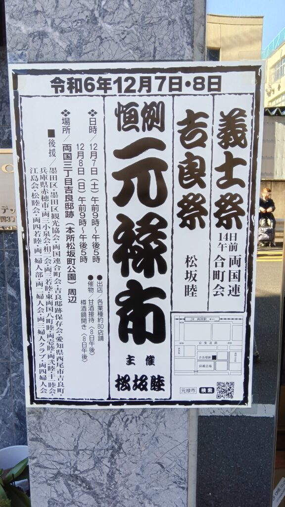 墨田区両国の吉良邸跡で毎年恒例の義士祭、吉良祭が開かれていました。元禄15年(1702年)12月14日の赤穂浪士の討ち入りで亡くなった吉良上野介の家臣20名と赤穂47名の合同祭を地元松坂町の有志(松坂睦)が執り行い、それに先立ち元禄市という市が立ちます。衣料品、日用雑貨、食糧品など80を超える地元のお店が特価で品物を販売していました。丁度昼頃の訪問で前に進むのが大変なほど人であふれていましたが頑張って吉良邸で手を合わせてきました。市は12月8日まで開いています。墨田区家族葬窓口は24時間365日、ご葬儀に関するご相談を受け付けています。葬祭ディレクター1級が在籍、誠心誠意サポートいたします。お気軽にお問い合わせください。フリーダイヤル0120-56-4940