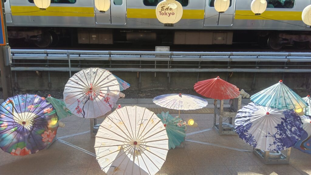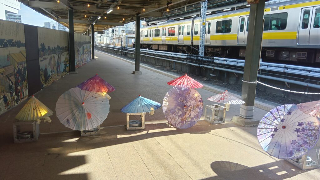 4年近く掛けてリニューアル工事をしていた江戸東京博物館がいよいよ来年1月31日にオープンします。それを記念して両国駅を中心にオープン100日前記念イベントが18日から開かれています。両国駅の「幻のホーム」と呼ばれる3番線ホームには和傘イルミネーションや北斎の浮世絵の大きなパネルが並んでいました。地下の通路には江戸時代の蕎麦や寿司の屋台の再現もあり、どちらもそのコンパクトさに驚かされました。広小路には縁日の遊び屋台も出店。旧安田庭園には和菓子のキッチンカーも出ているそうです。ホーム入口の無料で振る舞われる鴨南蛮には平日にも拘らず沢山の行列が出来ていました。100日前記念イベントは21日まで開催中。墨田区家族葬窓口は24時間365日、ご葬儀に関するご相談を受け付けています。経験豊富なスタッフがご家族の想いに寄り添ってお応えいたします。【電話】0120-56-4940お気軽にお問い合わせください。