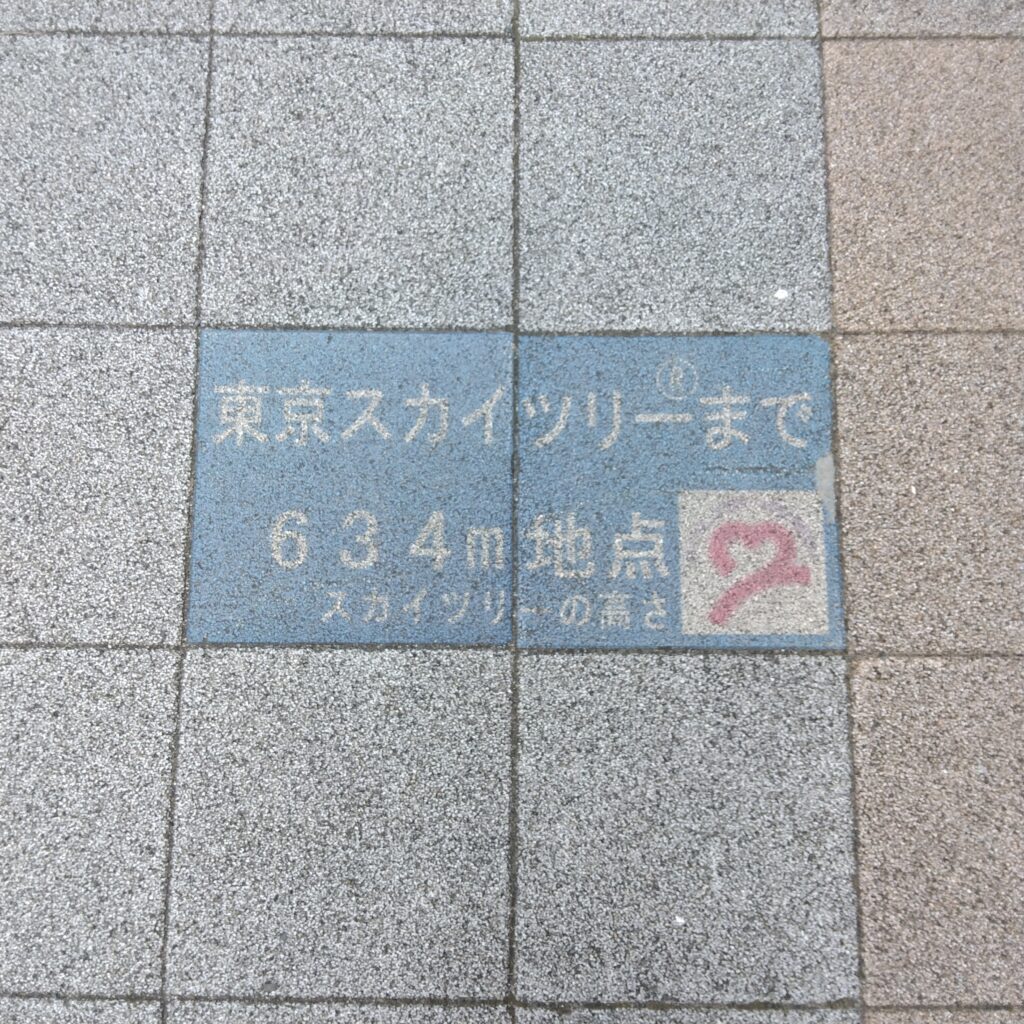 東京スカイツリーの高さは634m(ムサシ)というのは有名な話ですが、当社式場からほぼ真西30~40mほどの所にこんな表示があります。この地点からスカイツリーまで歩くとどの位の高さなのかあらためて実感できます。東京スカイツリーに来たときはぜひ探してみてください。また当社にもお寄り頂ければいつでもご相談承っております。