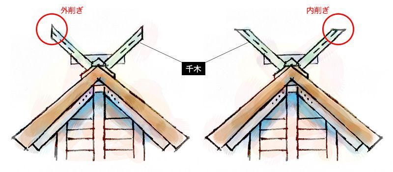 少し前から御朱印を集める趣味の方が増えているので知っている方も多いと思いますが、社の屋根にX状に交差した板木があります。千木(ちぎ)あれは古代の建築技術の名残りだそうで今は神聖な場所のしるしになったそうです。千木には外削ぎと内削ぎがあって外削ぎは男の神様内削ぎは女の神様を祭っているのだそうです(諸説あり)。