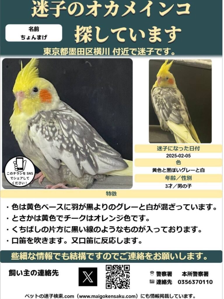まいごのオカメインコを探していますとチラシが入っていました。