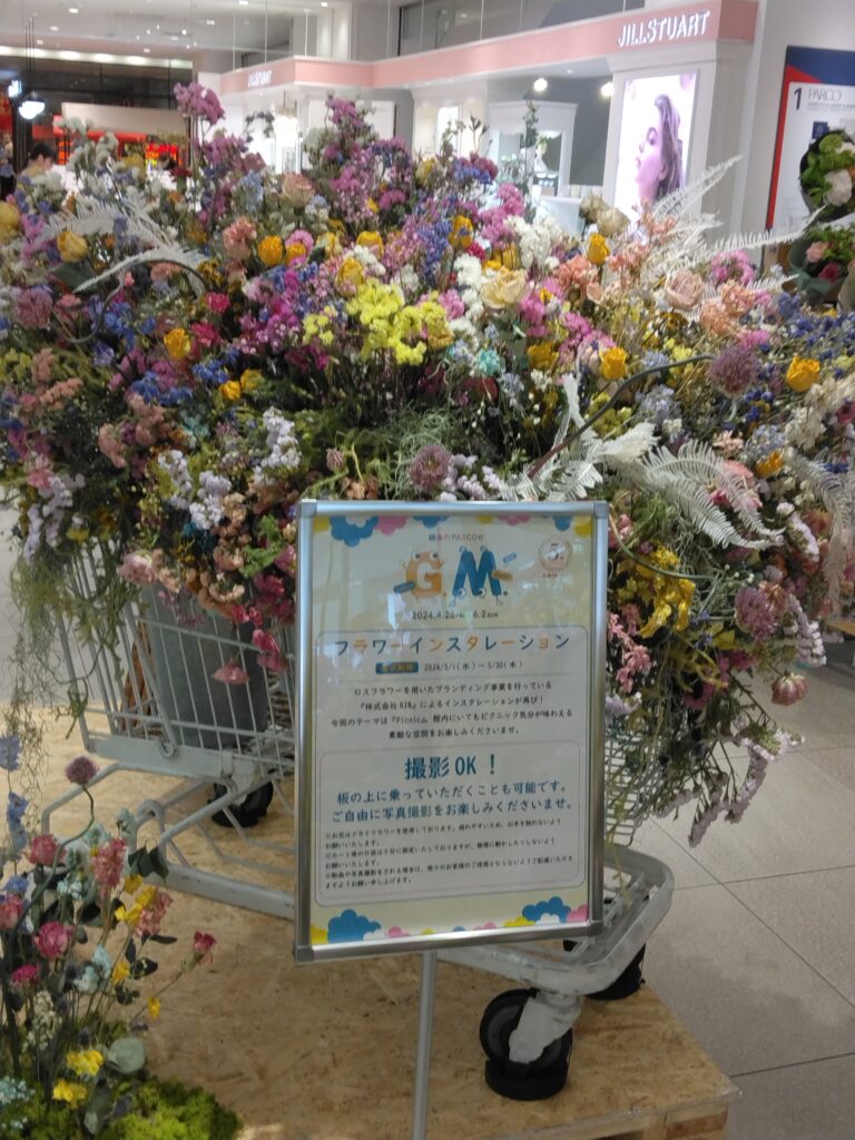 錦糸町のパルコの玄関にフラワーインスタレーションというのがありました。飾られて役目を終えた廃棄される予定の花々(ロスフラワー)をもう一度きれいに飾ってあげるということらしいです。ドライフラワーになってまたみんなの目を楽しませるのはお花も喜んでるのではないでしょうか?タイトルは「ピクニック」だそうです。