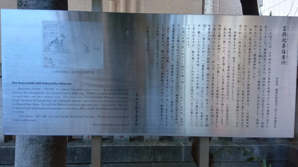 墨田区両国にある榛稲荷神社(はんのきいなりじんじゃ)は葛飾北斎が晩年(80歳代)に娘のお栄と一緒に暮らしていた地です。北斎は生涯90回も引っ越しを繰り返していたので、いつ、どこに住んでいたのかはよく分かっていないらしく場所を特定できるのは非常に珍しいケースだそうです。江戸時代ここには徳川幕府の馬場がありその馬場を囲むように大きな榛(はんのき)があったので榛馬場と呼ばれそこに祀られていたのがこの神社です。北斎はこのお稲荷さんに隣接?した場所に居をかまえていたということです。墨田区家族葬窓口は24時間365日、ご葬儀に関するご相談を受け付けています。そうです。誠心誠意サポートいたします。お気軽にお問い合わせください。 フリーダイヤル0120-56-4940