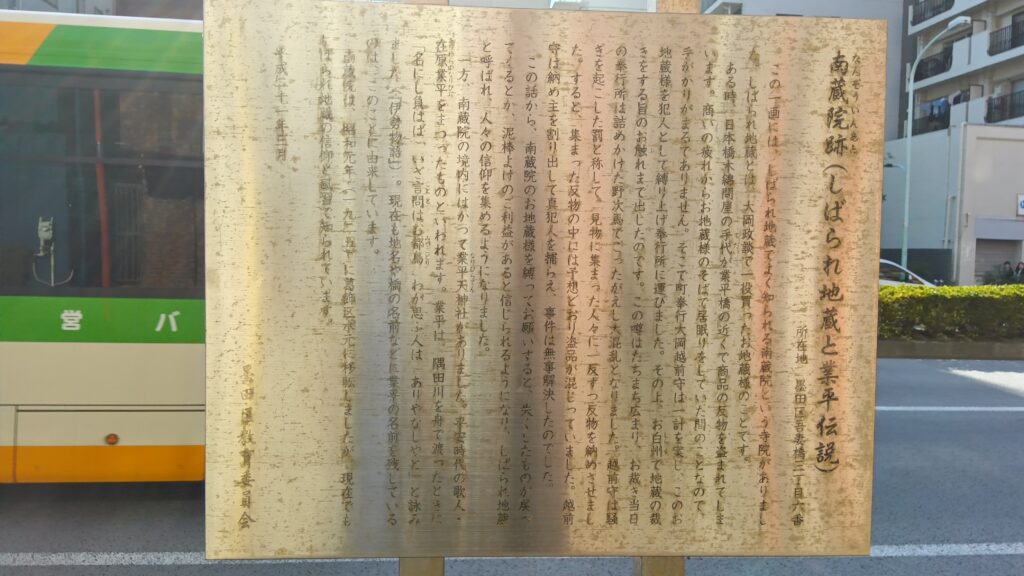 2024年大晦日のスカイツリーです。足元の業平橋には地名の由来の案内板がありました。吾妻橋3丁目のこの地にはかつて南蔵院という寺院があってその中に業平天神社があったそうです。案内板には詳しく書かれてないですが、いくつか説があって1つは在原業平が東に下る際、船で隅田川を渡る時に転覆して亡くなったので塚を建てそれが神社になった説ともうひとつは南蔵院の由緒にあるように在原業平が舟遊びをしていた時、船が転覆して多くの人が亡くなりその人々を弔うために建てた塚が業平塚と呼ばれ、そばに架けた橋を業平橋と名づけたそうです。因みに「縛られ地蔵」で有名な南蔵院は関東大震災後に水元に移転して沢山の方の信仰をあつめています。縛られ地蔵についてはあらためて書きたいと思います。本年もこのブログをお読みいただきありがとうございました。来年も宜しくお願い致します。墨田区家族葬窓口0120-56-4940